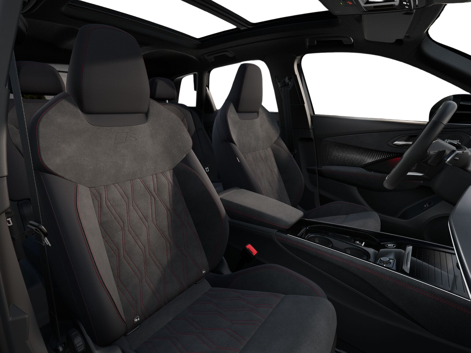 • Interieur S line mit Sportsitzen Mikrofaser (Sportsitze vorn, Sitzmittelbahnen in Mikrofaser Schwarz, Sitzseitenwangen und Kopfstützen in Stoff, Kontrastnähte in Grau, Vordersitze in Rautenmuster, Mikrofaser Dinamica, Ambientebeleuchtung Pro, Ladekantenschutz in Edelstahl, Pedale in Edelstahl)